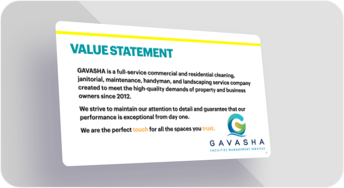 VALUE STATEMENT GAVASHA is a full-service commercial and residential cleaning, janitorial, maintenance, handyman, and landscaping service company created to meet the high-quality demands of property and business owners since 2012. We strive to maintain our attention to detail and guarantee that our performance is exceptional from day one. We are the perfect touch for all the spaces you trust. 2